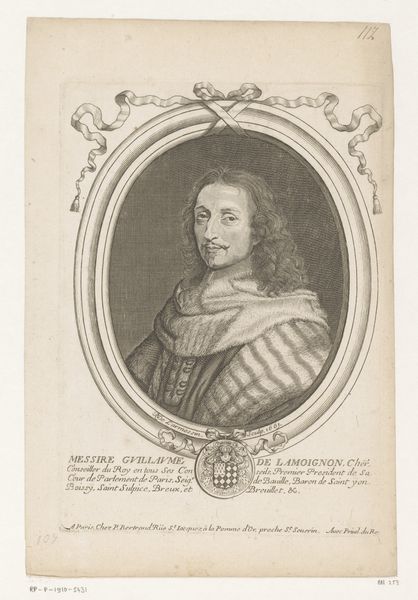Robert Nanteuil’s engraving, "Guillaume de Lamoignon," presents a study in monochromatic precision. The subject, framed within an oval, seems to emerge from a background meticulously crafted from fine lines. Nanteuil’s command of line and tone gives depth and texture to the portrait. The varying density of hatched lines defines the contours of Lamoignon's face and robes, lending the image a tactile quality. The composition, while traditional in its portrait format, achieves a dynamic tension through the subject's gaze, which meets the viewer directly, engaging us in a silent dialogue. The detailed rendering of the fur trim, contrasted against the smoother textures of the face, underscores Nanteuil's technical skill. Engraving, as a medium, inherently imposes structure. Nanteuil uses this to his advantage, creating a formal representation that speaks to the order and decorum of its era. Yet, within this structure, we see an attempt to capture the individual, hinting at the emerging importance of individual identity. The controlled lines and careful composition invite viewers to reflect on the interplay between representation, identity, and the enduring power of formal aesthetics.