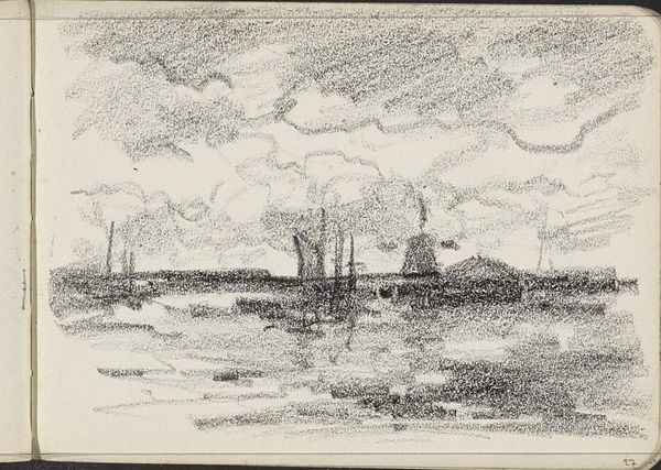 Curator: Looking at Willem Cornelis Rip’s 1907 drawing, titled "Rivierlandschap met molens en een boerderij," immediately evokes a somber, brooding atmosphere, doesn't it? Editor: Absolutely. The dense graphite and charcoal wash really creates this feeling, almost like an oppressive, lowering sky. It is very dramatic! Curator: Indeed. The stark contrast between the dark, swirling clouds and the landscape suggests a sense of turmoil or perhaps the coming of a storm. The windmill—a powerful symbol of Dutch ingenuity and industry— is rendered with a crude sketch aesthetic almost as if fading away. Editor: The artist uses a limited range of value here: primarily dark grey and some whites showing through to demarcate shape and dimension. Also the placement is curious, how the main form seems cramped and weighted into the left of the frame. Curator: The windmills stand in testament of their former power but now seem under threat by this storm system overhead. There's an ambiguity here: is this landscape under siege or is this landscape persevering amidst environmental forces. How do the mills stand as a reflection of our identity? Editor: Right, right, I agree but am struck by a curious tension; though visually quite heavy it communicates movement through all this expressive hatching and hurried drawing! What seems permanent – a horizon line and grounded windmill structure – is portrayed as being constantly reshaped, weathered, or eroded. There is so much energetic application in the sky above for instance. Curator: I’m also struck by the small house just beyond the windmill – or, maybe a small collective of houses clustered in the background – there seems to be a hopeful glow beyond all that dark shadowing; humanity is clinging to life, pressing onwards regardless. Editor: Ultimately it reveals to the viewer this fleeting sense of impermanence – both for these monuments and the land itself – within an environment they strive to live in regardless. The lack of refinement paradoxically makes that feeling very salient. Curator: Well said, yes. It is indeed a striking meditation on humanity's relationship with the landscape and time, rendered in just a few swift strokes. Editor: Absolutely; an elemental sketch revealing far more than a detailed landscape would be capable of conveying!