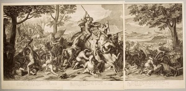 Editor: Here we have Bernard Picart’s “Defeat of Porus”. It's a chaotic scene, full of movement and struggle, but also kind of… theatrical? What do you make of this dramatic clash? Curator: Theatrical, yes! Picart, bless his heart, was illustrating history, but through the lens of Baroque drama. Notice how the figures are posed, almost like actors on a stage. It's less about historical accuracy, more about conveying the grand sweep of conquest, wouldn't you say? Editor: Absolutely. So, it’s less about what *actually* happened and more about the idea of victory and defeat? Curator: Precisely! It’s the *idea* of a battle, stylized and amplified. Think of it as historical fan fiction! I find it quite compelling, don’t you? Editor: It does make you wonder about the stories we tell ourselves about history. Thanks! Curator: My pleasure. Always a pleasure to unpack these narratives with fresh eyes!