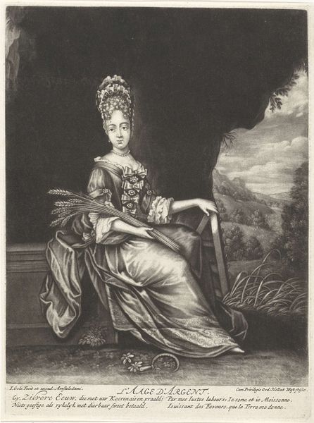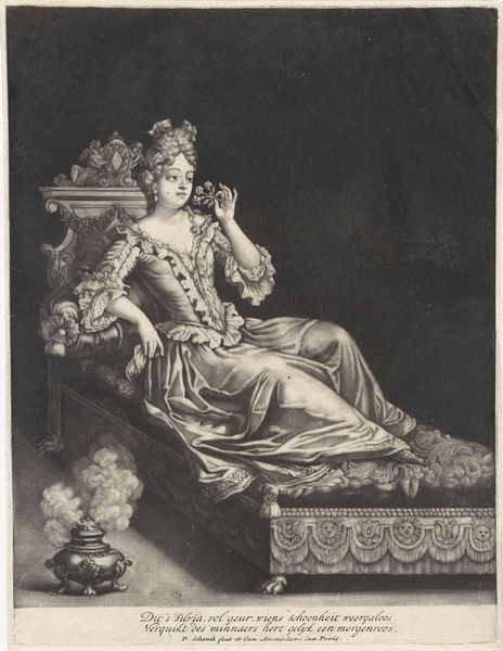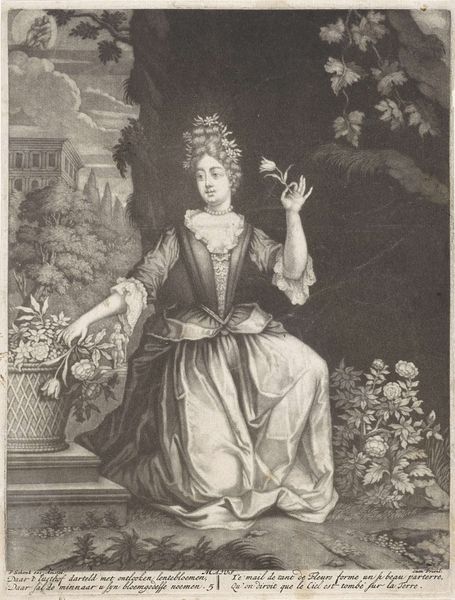 Pieter Schenk created this print, “Reuk: vrouw met bloemen in de handen,” which translates to Scent: woman with flowers in her hands, in the late 17th or early 18th century. The print is part of a series that depicts the five senses, reflecting a popular theme in art during that time. In this image, Schenk presents an allegorical representation of scent. Here, the figure of a woman is portrayed as an embodiment of the sense of smell. Notice how the flowers in her hands, along with her serene expression, evoke the pleasure and delicacy associated with fragrances. The composition and the woman's attire reflect the period's fascination with classical themes and elegant portraiture. Schenk's work invites us to consider the cultural significance of scent and its role in shaping our perceptions and experiences. The print not only showcases the aesthetic ideals of the time but also encourages reflection on how sensory experiences are intertwined with memory, emotion, and identity.