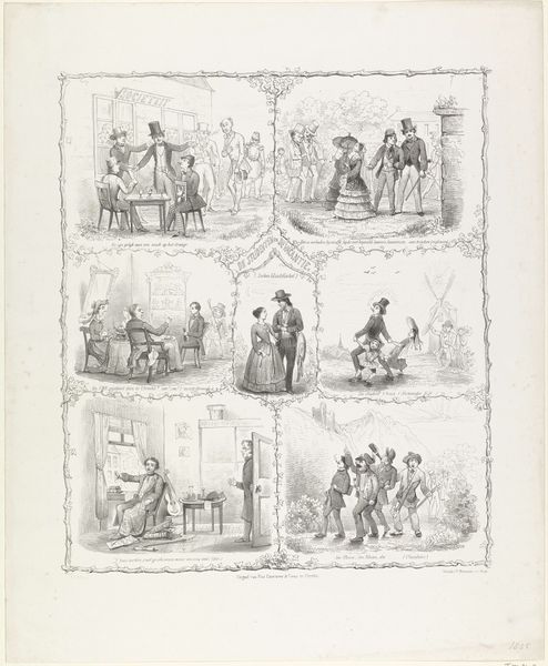 Victor Adam created this lithograph called 'Chat échaudé craint l'eau froide', or 'A scalded cat fears cold water', but we don't know exactly when. The composition implies a specific cultural moment in France, probably in the first half of the 19th century. The central image shows a well-dressed couple startled by a wet dog. The man and woman are recoiling, suggesting that they have been splashed. The artist conveys the idea of a collective experience within the society and the cultural moment: The central scene unfolds on a street with a building marked '113', giving a sense of place and social reference. Adam uses visual codes in the lithograph, such as the fashion of the clothing, to depict the social classes and values of the time, a theme that was very popular in the French press. What was considered humorous or worthy of satire? Archival research into periodicals from the period could help us better understand Adam's work.