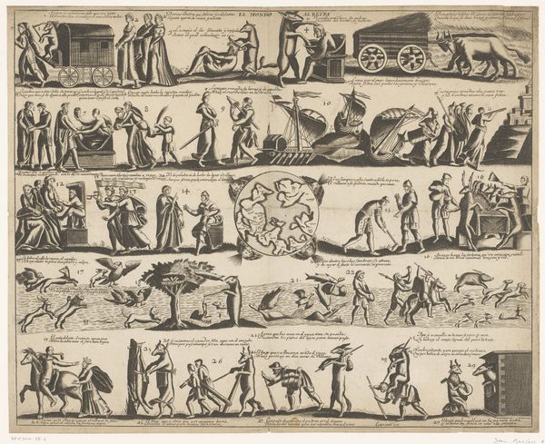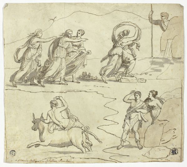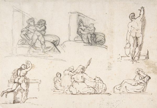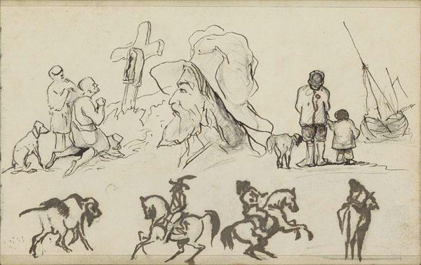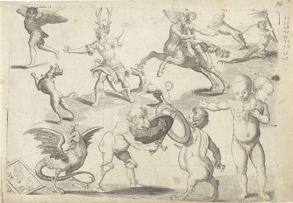 Curator: Look at this fascinating study sheet titled, "Studieblad met tekenvoorbeelden: figuren en dieren," or "Study Sheet with Drawing Examples: Figures and Animals" by Michael Snijders, created sometime between 1610 and 1672. It’s rendered in pen and ink on paper. Editor: Immediately, I notice the menagerie of figures – both human and animal, realistic and fantastical – crammed onto the page. There's a chaotic, almost whimsical energy here. Curator: Yes, precisely! The "sketchbook art" tag really captures the essence of this work, as it reveals Snijders in an academic context, experimenting and refining his craft. Study sheets like these were invaluable tools for artists in training and established masters alike. It’s great insight into workshops in general. Editor: The animal pairings draw my attention. Are the wolves fighting or playing? And what of the horse, prancing, with those peculiar man-like figures flanking it? Are these bestial symbols indicators of more cultural and philosophical perspectives? Curator: That's a brilliant question. Iconographically, animal combat often represented human conflict or the battle between good and evil. Horses, in particular, appear constantly in Dutch Golden Age art and embodied status. Given that Snijders lived during this very tumultuous period in European history, it’s fascinating to think of these figures not just as aesthetic exercises but as commentaries on the human condition. Editor: And the lone head at the bottom right! So classical in its rendering – what does that contrast suggest for the function of study? Curator: Indeed, the inclusion of that classical head speaks to the emphasis on imitation and adaptation in artistic training during that period. Copying the works of the masters was seen as a crucial step towards developing one's own unique style. And if the other animal/human pairings are to be taken as having symbolic importance, so too perhaps, we ought to remember the traditional philosophical association of reason with mankind and humans in general. Editor: Fascinating to consider the work as a locus of different exercises converging for the purpose of instruction but potentially giving much more! Curator: Absolutely, each character a mirror, perhaps, for the people that would study it. I see this page, this jumble of forms, and I'm seeing an artist very active and alive!