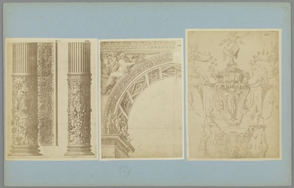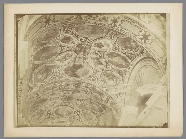 Curator: Here we have a photograph, dating from between 1857 and 1900, produced by Fratelli Alinari. It depicts Benozzo Gozzoli's fresco, "Joseph Makes Himself Known to His Brothers," located in the Camposanto in Pisa. Editor: It's... ethereal, almost ghostlike. The sepia tones soften everything, making it feel like a memory of a memory. Curator: The photograph serves as a documentary record, capturing the fresco's composition and spatial arrangement. Note the clear depiction of the architectural framing—those distinct archways, precisely delineated. Semiotically, these structures function as portals, separating different narrative planes. Editor: Planes of memory, too, I'd say. Seeing this old photo *of* the fresco makes me consider how the fresco *itself* was meant to freeze a moment in time, turning biblical story into something solid, real, accessible. So, what does the photograph of the fresco become? A layer further removed? Does that weaken the connection or somehow amplify it? Curator: That's a relevant consideration. As a photograph of a fresco, its texture and the subtle interplay of light and shadow hint at the original artwork’s materiality, without actually providing that texture directly. This creates a representational paradox, mediated through the photographer's choices of lighting and perspective. Editor: Paradox, indeed. And the perspective here—flat and head-on. The eye is given no escape; one must face history in all its faded glory. Ironic, maybe, since a fresco is, was intended as something *alive*, teeming with color! Curator: Exactly. Its documentary purpose transforms with time into an object ripe with interpretative possibilities. Editor: Almost as if, through age and translation of medium, the message has evolved *beyond* the messenger…or message bearer? Hmm. Thank you for making this interesting detour. Curator: A fitting end, I believe, to our observation on Gozzoli, Alinari, and the ever-evolving image itself.