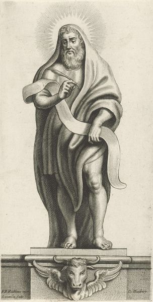 Petrus Clouwet’s engraving depicts Heilige Simon de Zeloot with meticulous lines, capturing both the saint’s solemnity and the symbolic objects surrounding him. Simon stands with a halo, draped in flowing robes. He's poised, as if in a moment of profound reflection, writing in a book. The composition directs our gaze not just to the figure but to the interplay between light and shadow, a dichotomy that shapes our reading of the artwork. The saw at his side, a traditional emblem of Simon's martyrdom, introduces a stark element that contrasts with the act of writing. The saw acts as a visual rupture, challenging any singular interpretation. Ultimately, Clouwet's engraving presents us with an image that invites contemplation beyond mere religious reverence. It is a complex interplay of signs and signifiers that prompts us to question fixed meanings.