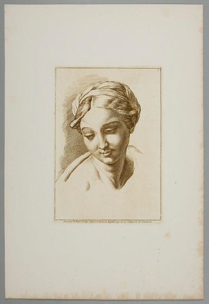 This is Bernard Picart's "Study of a Woman's Head, Eyes Downcast," made around 1713, using etching and engraving. The study presents a face in muted tones, its graphic lines creating soft gradations that define the features of the woman's head. The composition of the portrait, framed by a carefully rendered border, draws us to the subject's downcast eyes. What's intriguing here is the way Picart uses line and form to convey a sense of interiority. Her contemplative gaze suggests modesty but simultaneously invites the viewer to imagine her thoughts and emotions. This work operates within the semiotic conventions of its time, where female portraits often represented virtue and grace. Picart's formal choices, such as the soft shading and gentle lines, evoke a sense of sensitivity. In the end, it is Picart's masterful handling of the etching technique, with its precision and delicate touch, that makes this study so compelling. The work is an intersection between skill and artistic interpretation, where the formal elements serve to both capture and provoke thought.