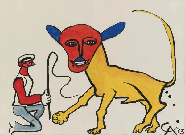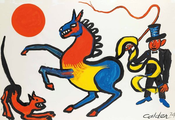 Editor: This is Alexander Calder’s "Yellow Cattle" from 1973, an acrylic painting that immediately strikes me as playful. The colors are bold and the shapes are simplified to almost cartoonish levels. What do you see in this piece, especially concerning its symbolism? Curator: It's fascinating how Calder distills the bull—an age-old symbol of power and virility—into these almost childlike forms. Consider the colors themselves; the vibrant yellow contrasts starkly with the black, which creates an immediate visual tension. Does this juxtaposition, perhaps, represent conflicting aspects of the bull's nature, its creative and destructive forces? What do you make of the abstract, coiled form beside it? Editor: I hadn't really thought about it as destructive! The coiled form… is that its tail? Or, could it be something more abstract – a representation of the bull's energy or perhaps its DNA? Curator: Perhaps! Note how that spiral, a form found across cultures to represent growth and evolution, here uses a restricted palette. Think of the labyrinth, another spiral form strongly connected to the Minotaur myth. Do you think Calder knowingly alludes to cultural memory, using recognizable images to express modern concepts? Editor: That’s such an interesting thought! It really shifts my perspective, thinking about ancient symbols being reworked here in a pop-art style. I was mostly seeing the surface, its lightness and simplicity, but now I realize how much depth there might be below it. Curator: Indeed, the simplicity may belie a complex web of associations, prompting us to reconsider how even seemingly basic forms can carry significant cultural and psychological weight. These images linger in the cultural memory.