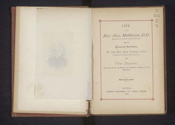 Editor: Here we have “Abroad and at Home,” a print from 1878-1879 attributed to T.B. Glanville. It's a photograph of the open pages of what looks like a journal, complete with a portrait and handwritten text. It feels intensely personal, almost like an invitation into someone's private world. What stands out to you? Curator: It's compelling to consider this "private world" in its specific historical context. Glanville was part of the Cape of Good Hope, actively involved in immigration commission. His dual existence “abroad and at home” signifies more than physical locations; it gestures towards the fraught politics of colonialism, doesn't it? The very notion of "home" becomes a complex issue. Whose home are we talking about? The colonizer or the colonized? Editor: That's a perspective I hadn't considered. I was drawn to the intimate nature of the journal, but you're right, the title throws a wrench in that interpretation. Curator: Exactly! And what about the photograph, carefully presented in an oval frame on the opposing page? How does that act to construct and convey identity, especially considering his role in the colonial project? Is it a statement of authority, of belonging, even of justification? Editor: So, it's not just a personal reflection, but a carefully constructed image, reflecting colonial power dynamics. I never would have picked up on that on my own. Thanks! Curator: Indeed! We’ve both pushed ourselves to think critically about the social and political dimensions of this intimate seeming journal. It’s a valuable reminder of art’s capability to contain and conceal such messages, requiring constant engagement from its viewers.