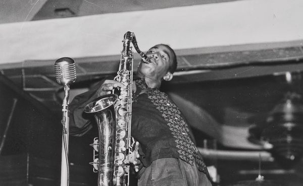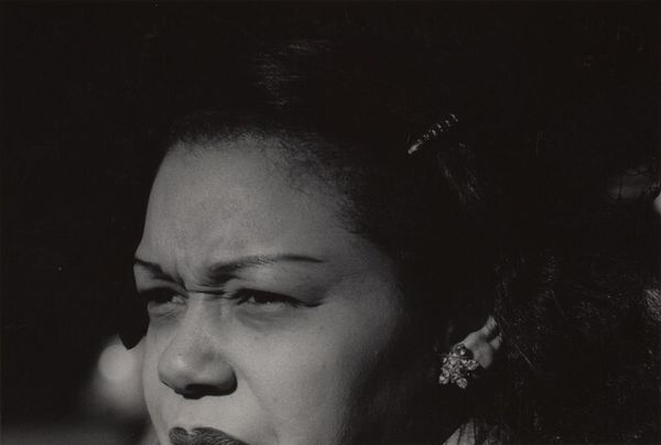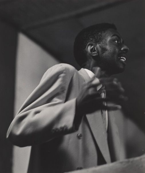 Editor: Here we have John Cohen's "Gospel Singers, Harlem," a gelatin silver print from 1954. It's an intense close-up; you can practically hear the music. What stands out to you in its composition? Curator: Immediately, the high contrast captures my attention. Note how Cohen manipulates light and shadow to emphasize the dynamism. The asymmetrical placement of the figures, combined with the intrusion of the microphone, creates a unique balance—or perhaps imbalance—that guides the eye. Does this contrast amplify the emotional weight, in your opinion? Editor: It certainly does! It almost feels like the singers are emerging from darkness. Do you see a narrative unfolding through Cohen's use of form? Curator: The stark blacks and whites serve as more than just representation; they embody the fervor inherent in gospel. The lack of depth, achieved through shallow focus, pushes the figures to the forefront. Also, note the granular texture typical of gelatin silver prints. This materiality contributes to the immediacy of the image. The frame’s edge seems to crop into their bodies. How does that add to its aesthetic value, do you think? Editor: That’s a great point – it intensifies the energy! Almost as if the sound is too big to be contained. Curator: Precisely. Cohen’s formal decisions amplify the expressive quality, inviting the viewer into a raw, unfiltered moment of spiritual intensity. I had never thought of the raw effect the crop had until your comment. Editor: Seeing how light, form, and even the materiality enhance the emotional impact makes me appreciate the photo in a new light.