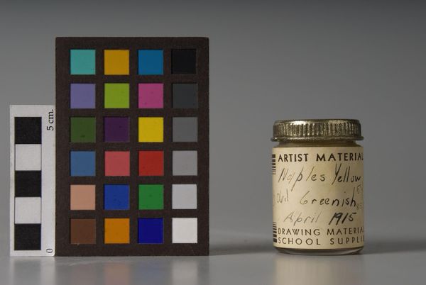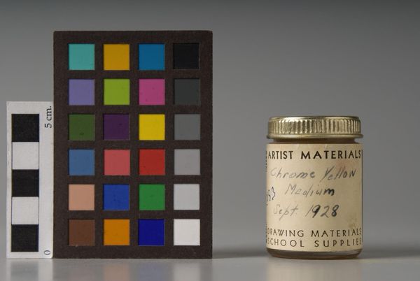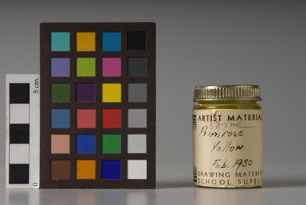 Editor: Here we have *Chrome Yellow Lt.*, a paint pigment manufactured in 1923. It feels like holding a piece of art history. What do you make of this seemingly simple object? Curator: It's fascinating how something so utilitarian can hold such symbolic weight. The jar itself becomes a vessel of cultural memory. Consider the color yellow: historically, it represents optimism, enlightenment, but also caution. Editor: The handwritten label adds a personal touch. Curator: Absolutely. The inscription anchors the jar in a specific time and place. What does that gold star signify to you? Perhaps a reward, a symbol of excellence? Or perhaps the opposite: the star as branding, part of a system? Editor: I hadn’t thought of that. Now I see it as a coded message about the artist’s aspirations and context. Curator: Exactly. The object becomes more than just pigment; it's a tangible link to the past.