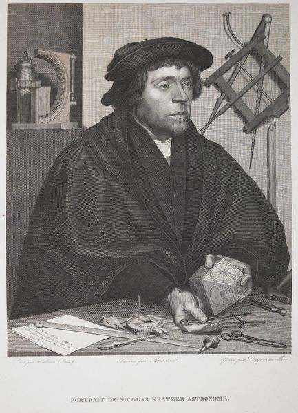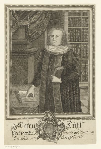 Editor: So, here we have "Portrait of the pastor Justus Modersohn," an engraving made sometime between 1693 and 1734 by Johannes Klopper. It's quite detailed, but also rather somber, wouldn't you say? He looks like a very serious man. What strikes you most about this piece? Curator: Somber is one word, yes, though I sense also a certain intellectual weightiness. Imagine the scent of aged paper, ink, and hushed tones filling the air around him! Klopper has captured a certain kind of devoutness. It's fascinating how the baroque era, even in portraiture, carried such theatrical flair, no? It’s almost as if Modersohn is a character in his own sacred drama. Do you feel the same sense of staged presentation? Editor: Yes, I see what you mean! The bookshelf and curtain behind him feel almost like a stage set. So, this theatrical feel – does it reveal something about Baroque art in general? Curator: Precisely! Everything is heightened, imbued with a kind of hyper-reality meant to move you. Notice the folds in his robe, the light catching the edges of the book. It all speaks to a desire to make the spiritual tangible, to connect earthly presence with something beyond. Even in a more humble engraving, it seeps through! He isn't merely sitting. He IS embodying the power of knowledge and devotion. Editor: That's a powerful way to think about it. I'd never considered how much theatre could be present in a portrait. Curator: Indeed! Now, looking at this, how could we bring this understanding of staged devoutness to a more contemporary piece? It makes me think about… Editor: It's fascinating how something from so long ago can still spark such rich connections today. Thanks!