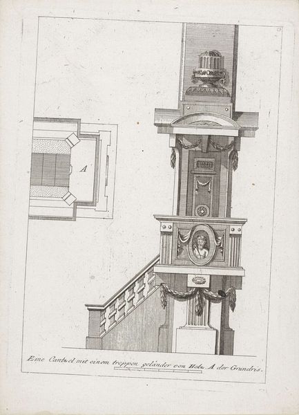 Curator: This detailed engraving from 1790, currently held here at the Rijksmuseum, is titled "Preekstoel met het Lam en het boek met de zeven zegels"—that's "Pulpit with the Lamb and the Book with Seven Seals." Editor: My goodness, it feels very... diagrammatic. Cooly rational, but the subject is just bursting with symbolism. Does the clinical style serve a purpose, beyond architectural record? Curator: Absolutely. Though the artist remains anonymous, we see clear Neoclassical influences—that emphasis on clarity, order, and those clean lines. It presents the religious subject in a highly rational, almost engineered way. Editor: Almost like they are trying to fit all the unknowable into geometric form and logic. It’s so meticulous! You've got the Lamb, the Holy Spirit rendered in beaming rays, and is that a representation of Revelation? Talk about ambitious architectural theming. Curator: Precisely. And note how this imagery isn't simply decorative; it informs the very structure. The pulpit isn't just a place to preach; it’s a symbolic representation of divine authority. The engraving elevates this religious structure to something almost monumental. A symbol of order and divinity, wouldn’t you say? Editor: No arguing that. Thinking of it existing inside a church... I imagine standing there listening, would have really made a believer feel divinely spoken to, beneath such an imposing... theological blueprint. I can feel its influence, even two centuries on. Curator: It makes you wonder about the role imagery like this played within its religious context, especially regarding authority, isn't it? It certainly provided an interesting lens to view how religion shapes and occupies space. Editor: Definitely, and considering how different that interpretation might be from our current vantage, where things of faith are frequently upended or at odds with the structured systems in which we function. Thank you for revealing the narrative under the lines of that fascinating piece!