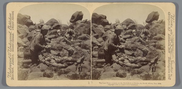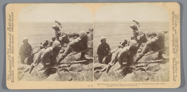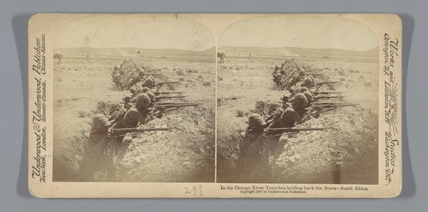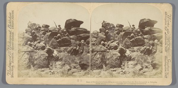 Editor: This gelatin silver print, titled "Geënsceneerde voorstelling van Britse soldaten op een heuvel in Zuid-Afrika," by Underwood & Underwood, was made in 1901. There's something stark and unsettling about this seemingly quiet depiction of soldiers. What do you see in this piece? Curator: I see layers of historical memory embedded in the sepia tones of this image. Note the figures hugging the earth, a literal embodiment of colonial entrenchment. But consider the weapon—the rifle extends them, almost merging them with the rocky ground, extending the empire. Do you think that merge intentional, a suggestion of both conquest and ownership? Editor: It could be, it definitely adds to the sense of a kind of forceful belonging. Like, these soldiers *are* this landscape now. Curator: Precisely. It raises difficult questions about visibility and erasure. The soldiers, rendered in such a way as to seem at one with the environment, simultaneously blend in and claim ownership of the land. What enduring narrative does that reinforce, visually speaking? Editor: A narrative of dominance, perhaps. That the colonizer is naturally, inextricably linked to the colonized land. Curator: The symbol of that "natural" bond carries enormous weight, even now. Underwood & Underwood mass-produced these images, almost like souvenirs, propagating a particular view of the world for the folks back home. Editor: So it's not just a photograph, but a carefully constructed symbol with its own intended audience and message? Curator: Exactly. It's a complex artifact that performs more than it portrays. I look at that soft sepia tone and it hits a cultural nerve that speaks volumes. Editor: That's really interesting, I hadn’t thought of it like that, seeing how this photo isn't just showing something, but it *doing* something.