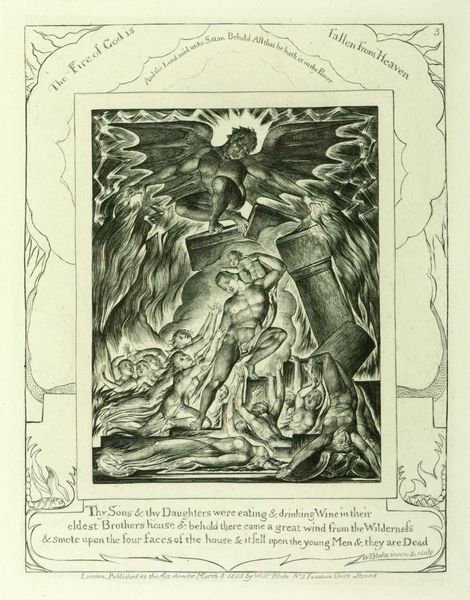 Curator: Here we have William Blake’s print, "The Vision of Eliphaz." He created this around 1825. Look at how small it is, barely larger than a postcard. Editor: It feels vast, though, doesn't it? That towering figure and the swooping, almost claustrophobic dark clouds give a sense of tremendous space and spiritual drama. Curator: Blake was fascinated with the Book of Job, and this depicts Eliphaz's terrifying vision. It's about divine judgment, the limits of human understanding... Editor: And it’s rendered with such incredible light and shadow. You feel the fear of those figures below, the awe, the sense of something truly beyond comprehension. It's a bit frightening, but in a beautiful, thought-provoking way. Curator: Blake often challenged conventional religious views. This image asks uncomfortable questions about faith and morality. Editor: It makes you question everything, doesn't it? Blake had a real gift for the unsettling. Curator: Absolutely, his art is always a deep dive.