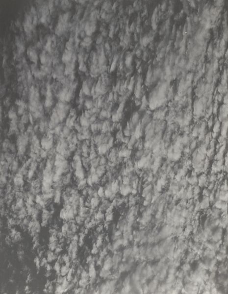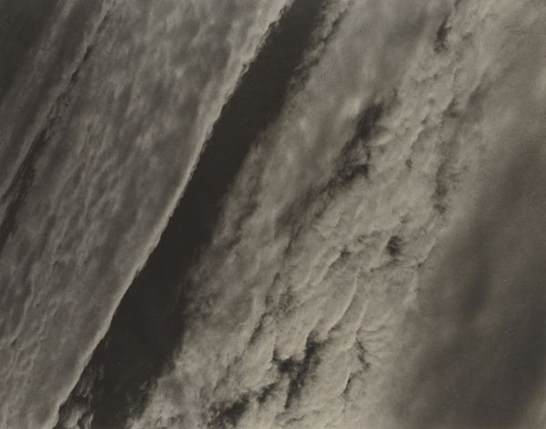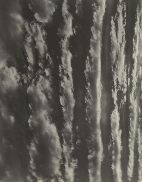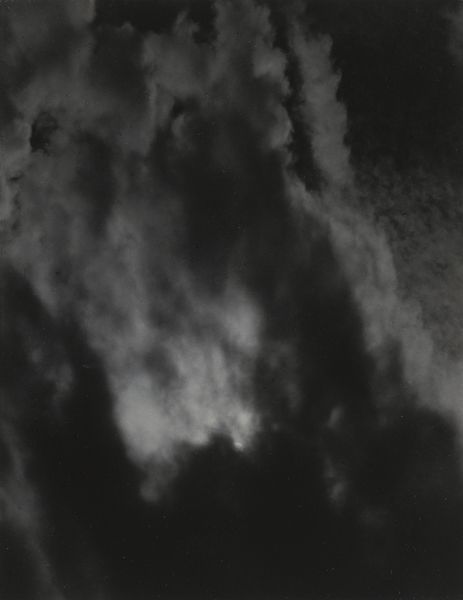 Editor: We're looking at Alfred Stieglitz’s “Equivalent,” a photograph from around 1929. It's a black and white image of clouds, incredibly textural and almost tactile. What strikes me is how a scene so ordinary becomes so powerful in this high-contrast rendering. What's your perspective? Curator: The power lies precisely in how Stieglitz elevates the mundane. He harnesses photography, a medium often relegated to mere reproduction, and transforms it into something...more. Consider the social context: mass production was exploding. He's not just showing clouds, but reclaiming artistic value through the hand, through the very specific choices of camera, lens, and darkroom manipulation. What do you think of the process? Editor: It's interesting you bring up the labor involved. Looking at the textures, you can imagine him meticulously working in the darkroom to bring out the tonal range. Do you see this as a challenge to traditional painting? Curator: Absolutely. By focusing on the tangible aspects of photographic production – the chemical processes, the manipulation of light and shadow – Stieglitz democratizes art-making. It’s less about innate talent and more about the skillful handling of materials and the application of labor, a deliberate rejection of art as an untouchable commodity made by the divine hand. He suggests something ordinary like a cloud formation can reflect an individual’s emotional or spiritual state, which, interestingly, became quite a commodity later on. Editor: So it is about the process and materiality as a means of expressing something deeply personal. It certainly reshapes my understanding of photography. Curator: Exactly! It challenges the accepted hierarchy of art, pointing to the artistic potential embedded within everyday practices and materials. I never thought about it that way until now!