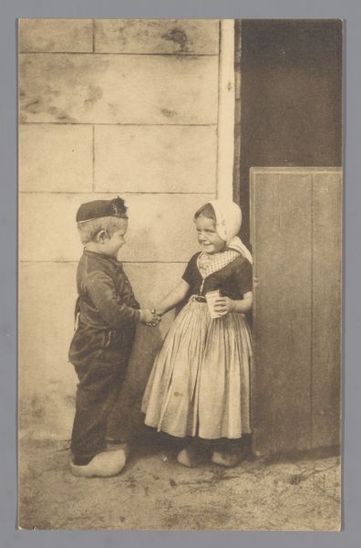 Curator: Let's turn our attention now to a curious little albumen print, “Josephine Vendue, Par Ses Soeurs,” dating from around 1885 to 1891. It's part of the Actors and Actresses series, type 1, from Virginia Brights Cigarettes, created by Allen & Ginter. Editor: Oh, she looks so crestfallen! It's like she’s been caught in a very awkward performance, the kind where you forget your lines and suddenly remember all the things you should’ve done differently in your life. Curator: Indeed. The composition directs our gaze via the actors' interaction. Semiotically, her posture implies a state of being acted upon, which aligns well with the image's title, 'Josephine Sold by her Sisters.' Editor: The man’s gesture, the way he offers whatever’s in his hand—it reads like a bribe or perhaps payment for betrayal. Makes you wonder what Josephine did to end up on the auction block... figuratively speaking, I presume! The stark sepia tones amplify this sense of old-world drama and almost cinematic tension, right? Curator: Precisely! This image engages structuralist frameworks; the arrangement is designed to generate narrative, not just represent individuals. The photographic medium flattens depth, foregrounding relationships and hinting at social transactions typical in 19th-century theatrical genre paintings. The photograph isn't simply capturing a moment but staging one steeped in a coded morality play. Editor: There’s a stiffness, almost forced sincerity about their expressions—which actually lends authenticity in a weird way. People posing in character; very meta even by today's standards. Did it help sales, to put such images on cigarette packs? Talk about merging art with commerce in the most brazen way. Curator: Absolutely! And that commercial purpose shifts our understanding—it is, after all, designed for mass consumption; creating accessibility but simultaneously potentially cheapening theatrical meaning. The actors became objects in trade, ironically mirroring Josephine's circumstance within the photographic mise-en-scène. Editor: So it’s a comment on selling out, masquerading as advertising. Brilliant! It leaves me oddly melancholy; I am still thinking of her performance and the male actor's ambivalent facial expression; both forever frozen by Virginia Brights, what a world!