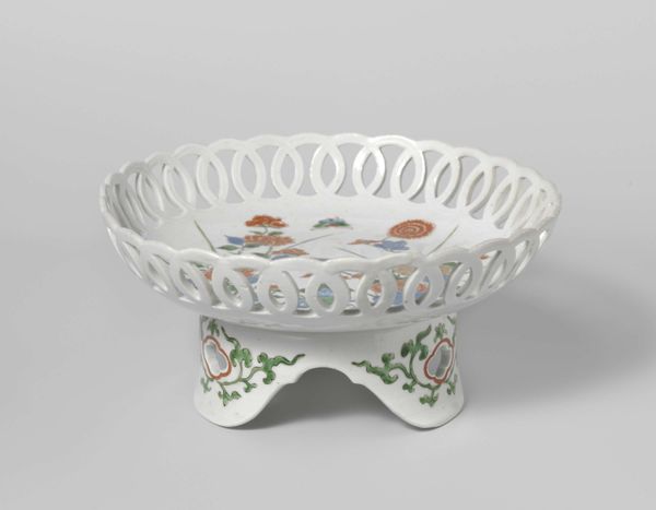 Curator: This charming ceramic piece, a "Saucer-dish on tripod with flowering plants near rocks," dates back to around 1700-1724. It is held in the collection of the Rijksmuseum and was created by an anonymous artist. What's your initial take on it? Editor: Well, my immediate impression is of restrained opulence. The delicate openwork rim and elevated tripod base create an air of preciousness, but the painted floral details introduce a grounded, naturalistic element. Curator: Absolutely. Objects like this are so evocative of the trade routes and cultural exchange that were shaping early modern Europe. Pieces of porcelain arriving from Asia became status symbols, embodying refinement and global interconnectedness. The craze led to local European manufacturers producing Delftware as well as other variations. Editor: You know, that porcelain body speaks to so much. For one, flowers symbolize various, sometimes contradictory, things, like beauty and ephemerality. Do you think this composition points towards any particularly salient readings of these emblems, given their social context? Curator: That’s a great point. Given its production timeframe and market, these were pieces made for the domestic lives of affluent families and were definitely a source of cultural and social display. But such art was meant to serve domestic functions too; these flower paintings may speak towards ideas of homemaking. Editor: The detail of the pierced rim is just masterful. It elevates the piece. Curator: It certainly does, showcasing both technical skill and stylistic trends. I would also say that a floral and rocaille style that followed speaks about elite notions of "taste." Editor: These pieces demonstrate such incredible artisanal virtuosity. In that case, the role of craft, labor and specialized artistry come into play in complex economic systems that fueled these commercial interactions. Curator: Precisely! And ultimately, its symbolic weight—and the aesthetic pleasures it offers us today—derives from those historical layers. Editor: I’ll be contemplating it anew on the way out now. Thanks for giving us that added detail!
