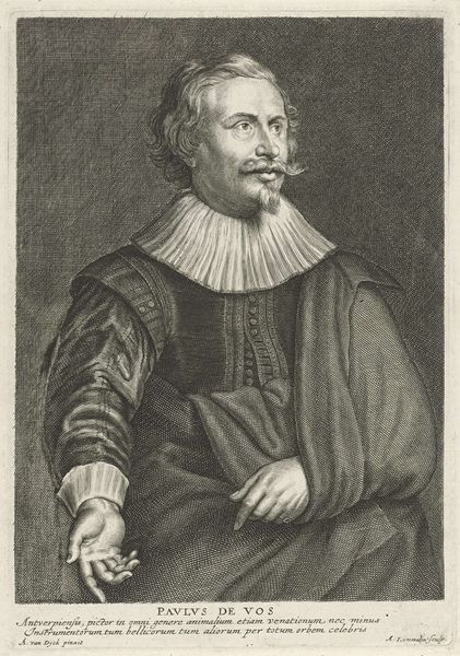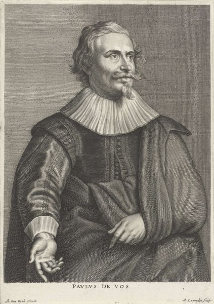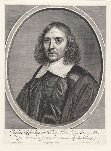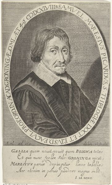 Editor: Here we have a print from 1644, "Portret van Frederick Spanheim op 44-jarige leeftijd," created by Cornelis van Dalen I. It’s striking how detailed the engraving is; it almost feels photographic. What stories do you think this portrait is trying to tell, given its time period? Curator: Ah, this portrait, a window into a world of burgeoning intellect and religious fervor. I see a man framed, literally and figuratively, by his achievements – the inscription surrounding him a testament to his academic prowess. The stern, yet subtly kind, gaze suggests a deep thinker, a man wrestling with the ideas of his time. Editor: He does look intense. It's interesting how they use the oval frame. It feels like peering into a different time. What significance do you attach to that? Curator: The oval, think of it as a Renaissance echo, a whisper of humanism grounding this baroque individual. It's a frame that both contains and elevates him, setting him apart, almost as if he were a jewel. What feelings does the text framing him evoke in you? Does it resonate with modern academic portrayals? Editor: I think the framing text reminds me more of official achievements being listed on a commemorative plaque. It highlights status, knowledge, a man of importance... It seems incredibly formal by today’s standards. Curator: Exactly! The contrast is telling. It spotlights the values of that era - reverence for scholarship, the weight of religious authority. A far cry from our casual graduation photos, isn't it? The weight of history, literally etched in ink. I feel it asking us, how will *we* be remembered? Editor: That's an interesting perspective. Now I’m pondering on how our era’s visual language will be viewed centuries from now. I definitely see more in it now than just an "old engraving style" from the Dutch Golden Age! Curator: Yes, and that’s the real magic of art, isn’t it?