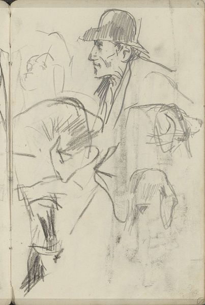 This drawing, Studies van een man die zijn hoofd met een hand ondersteunt, was created by George Hendrik Breitner. The artist renders several studies of a man’s head, each resting in his hand. The composition, with its overlapping figures, creates a sense of depth but also of unease. Breitner uses a limited tonal range, with the stark contrast between the graphite lines and the pale paper heightening the emotional intensity. There's a structural relationship between the way the form of the hand cradles the head, suggesting a gesture of support or perhaps weariness. The visible, raw marks destabilize traditional notions of portraiture, emphasizing instead a semiotic exploration of gesture and emotion. We are invited to consider not just what is represented but how it is represented, challenging our expectations of form and narrative. This artwork is not just a depiction of a man; it is an investigation into the very act of seeing and understanding.