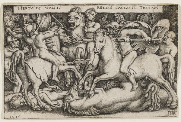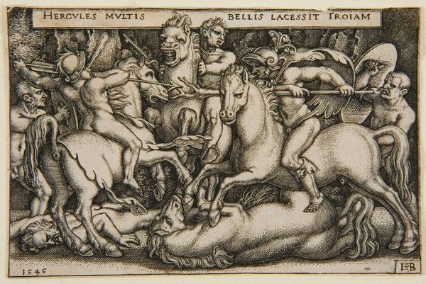 Editor: Right, let’s talk about this fascinating engraving, “Hercules Fighting Against the Trojans, from "The Labors of Hercules", dating back to the mid-16th century and created by Sebald Beham. It’s a whirlwind of action! I’m struck by how chaotic yet controlled it feels with all the lines. What's your take? Curator: Ah, chaos choreographed! I love that description. It’s like looking at a brawl in a very organized mosh pit, isn't it? This print is teeming with the kind of frenetic energy typical of the Northern Renaissance. Look at the way Beham crams every inch of space with detail—it's almost claustrophobic, and somehow still makes sense. It's as though he wanted to mirror the epic scale of Hercules's struggles in the very fabric of the artwork. Editor: Yes, totally claustrophobic! All these horses and fighters are stacked. I wonder how people at the time would see all that muscular violence on display. Curator: That's a superb point. In the Renaissance, prints like these were, in some ways, the "blockbuster movies" of their day. They provided a window into classical stories, repackaged for a contemporary audience. Beham, you see, wasn’t just illustrating a story; he was interpreting it for his time. Violence, heroism, struggle, all meticulously rendered for a public hungry for tales of might and moral lessons, which in themselves were pretty violent. Editor: Moral lessons packaged in, let's say, a muscular wrapping paper! I'll look at Renaissance art in a new way from now on, thanks. Curator: Exactly! I guess that’s how artwork keeps sparking new conversations, and maybe even some pleasant aesthetic turmoil.