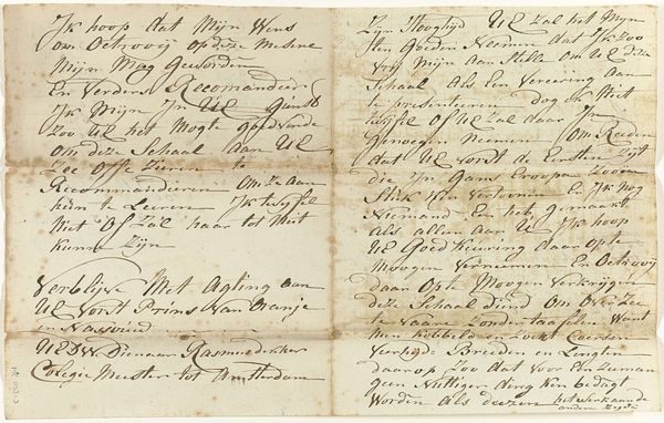 Curator: So, what grabs you about this... scribbled missive? It’s titled "Brief van ds. Hooyman aan Jan Brandes," or "Letter from Reverend Hooyman to Jan Brandes," created somewhere between 1779 and 1785, crafted with ink on paper. I’m really drawn to it's homemade aesthetic, like peering into someone’s personal thoughts frozen in time. The script, while tough to decipher, feels... intimate. What's your take? Editor: It has this incredibly personal feel to it. Looking at the faded ink and the delicate paper, I feel almost as if I'm intruding on a private conversation. All this beautiful hand-lettering must contain so much... Curator: Exactly! Think about the rhythm of quill on paper. This wasn't tapped out on a keyboard. Every stroke, every flourish, represents conscious intent. These lines, though orderly, they give me a palpable sense of the writer's personality—efficient and precise. Does this contrast with how we fire off quick messages today? How often do we consider how it would be if every message was handmade and written with care, with a special ink, in beautiful characters? Editor: I see what you mean. It highlights how impersonal our modern communication can be. Did people really communicate like this? Curator: It was an art form, and vital. Consider the time it took to compose, to literally *hand-write*, a letter. Each one a commitment. You feel it here, don’t you? It transcends mere words and gives a more subtle and powerful sense of intention, doesn't it? What could you conclude if it was addressed to you? Editor: I definitely understand better that even common messages in old days were an art and contained an implicit message. So interesting!