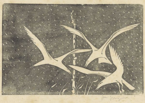 Editor: This is "Fish" by Milton Avery, a linocut print from 1952. It’s wonderfully simple, almost childlike in its execution. The muted green and the stark white of the fish create a really striking contrast. What captures your attention when you look at it? Curator: It's funny you say childlike! I'm struck by this piece's capacity to communicate volumes through just a few confident marks. It's a bit like a haiku— distilled essence. I see Avery's genius in stripping away the non-essential, arriving at something archetypal. The textures of the printmaking itself, do they conjure up something for you? Like a memory, or a feeling? Editor: I see what you mean, there is a primitive kind of quality here that appeals! The slightly imperfect texture does add character, almost like handmade paper. It makes it feel very tangible. It reminds me of vintage book illustrations actually. Curator: Yes! Absolutely! The artist isn't afraid to let the medium speak, those slight imperfections. Think about Avery's contemporaries, those abstract expressionists consumed by grand gestures and immense scale! Then we see this print…so humble in comparison. What do you suppose that signifies? Editor: Maybe it was his way of resisting that trend, going back to something more grounded and relatable? Like a quiet protest against the noise? Curator: Perhaps! Or perhaps it’s just Avery being Avery, wonderfully and stubbornly himself. Its beauty exists within its self-imposed limitations. Do you feel you can apply Avery's methodology to your own artistic practice? Editor: That's a cool point. Less is more and I definitely needed to be reminded. Curator: Indeed! Next time I go fishing I will never see fish the same way!