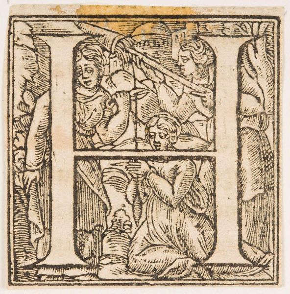 Curator: This woodcut, titled "Letters: L," is an anonymous work currently residing at the Harvard Art Museums. Editor: The stark contrast immediately draws the eye. It's playful, yet the figures hint at something deeper, perhaps a commentary on innocence or liberation. Curator: Absolutely. Consider how the imagery—putti, a goat, abundant foliage—resonates with Renaissance ideals of pastoral life and classical mythology, often employed as symbols of power and status. Editor: That's interesting. Viewing it through a contemporary lens, I see themes of freedom and control intertwined. The putti appear to be enacting some ritual of dominance over nature. Curator: Precisely. The choice of the letter "L" itself begs the question: L for what? Perhaps "liberty," or maybe something more specific to the socio-political context of its creation. Editor: Food for thought. This piece acts as a reminder that even seemingly simple images can hold complex narratives about the human condition.