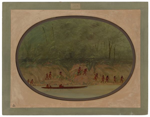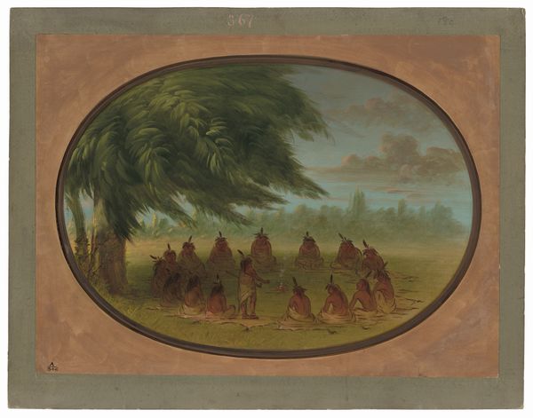 Curator: What strikes me immediately is the procession and almost ritualistic air about this image, with the people depicted becoming so small with distance. Editor: Indeed, that long trail really draws the eye, doesn’t it? The watercolour gives the whole scene a sort of dreamlike, receding quality, as if remembering a mythic past. Let's provide some context for our listeners. What we’re viewing is “Indian File - Iowa” by George Catlin, a painting dating from sometime between 1861 and 1869. Catlin, of course, is famous for his portrayals of Native Americans. Curator: The choice of watercolor gives it an ethereal feel but may not necessarily make it true, especially when we view how, for centuries, colonizers misrepresented Indigenous Peoples to fulfill self-serving agendas. Even now, many books contain damaging inaccuracies about American Indian culture. Editor: I see your point completely! But consider the artist and his role as witness – it may feel ethereal due to loss – as this march could echo not just cultural continuity, but the literal vanishing, the deliberate erasure of cultures… does that hit too hard? Curator: Not at all, you’ve highlighted an essential tension – the enduring cultural memory versus the brutal reality of dispossession. That perspective shift adds depth to the interpretation of the visual motifs; for example, their arrangement becomes indicative of unity. In cultural imagery, single file positioning may indicate forced removal as well. Editor: Right! And note the subdued palette. Is it elegiac, tinged with loss? I keep coming back to the dreamlike effect – memory itself fading. I wonder how intentional that was? Is the work then simply representational or intentionally laced with complex emotions of time and historical memory? Curator: It is probably both. Given that Catlin completed much of his work after extensive first-hand accounts of Native American tribes throughout the American West in the 1830s, and that there are questions of how and who determined "Indian Territory" that was and is the locale Iowa in this painting... The cultural image then is multilayered because this work is not simply about depicting a file of Ioway persons. Editor: A good point; the iconography and history behind the land cannot be extracted, further illuminating Catlin's perspective! It may very well show loss but may have a tint of ignorance about its greater role as one to paint history and the need for representation during that time. Curator: I appreciate this analysis – a deeper view to consider the relationship between continuity, visibility and imposed historical oblivion. Editor: Me too, a starker impression lingers than before we began.