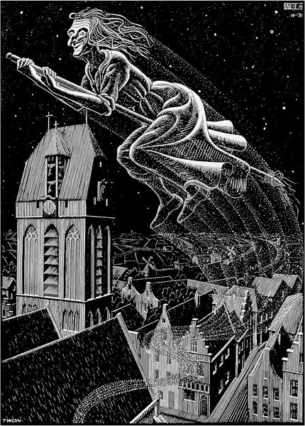 M.C. Escher made this wood engraving, Scholastica (Flying Witch), and you can see how he used black ink to carve away the white parts of the block, a process of both adding and subtracting to make the image. Look at how the marks create texture, especially in the witch’s streaming hair and the feathery details of the broom. This isn't paint, but the feeling of movement is still there, like a brushstroke frozen in time. The linear patterns in the claws and goat are kind of mesmerizing. I always think about how an artist decides where to leave the white space. Here, it makes the witch almost transparent, ghostly, as if she is part of the night itself. It reminds me a bit of Dürer's prints, how he could create such depth and atmosphere with just black and white. Ultimately, art is about seeing and showing, and Escher does it in a way that keeps you looking, thinking, and wondering.