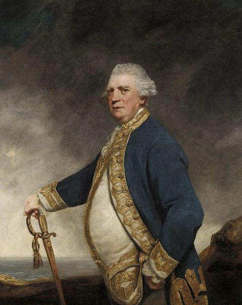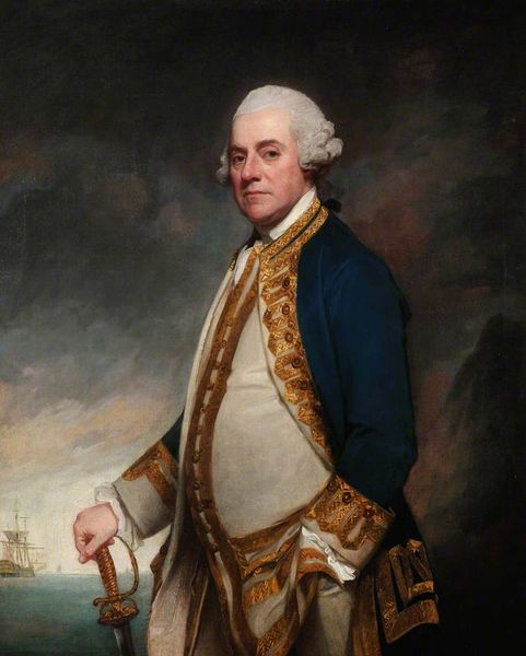 Curator: Before us hangs a portrait of Vice-Admiral Sir Hyde Parker, painted by George Romney. Editor: What strikes me immediately is the drama of the sea behind him, turbulent and filled with battling ships. He points outward as if commanding the very scene unfolding behind him. Curator: It's interesting you say that, because while Parker was indeed a significant figure in the Royal Navy, his career, particularly his later years, was…complicated. He often found himself overshadowed and his contributions debated. Editor: Well, in terms of symbolic reading, the stormy sea is an archetype of conflict, perhaps even the turmoil of naval command. But then you have Parker himself, a solid presence with an air of determination. Even his slightly rumpled waistcoat lends him a grounded feeling. What do you see of that tension? Curator: I think Romney aims to depict Parker as more decisive and commanding than history might remember. The inclusion of the naval engagement implies his active participation and leadership. But you also have to remember that portraiture was often used as a tool to bolster reputations and negotiate power. Editor: So the landscape acts almost like a backdrop in a stage play where Parker is the main player, and every detail, from his steady gaze to the sword at his hip, contributes to his image of power. It’s a potent, even heroic, visualization of duty and service. Curator: Indeed, the artist uses Romantic ideals, but the painting exists in the practical world of how leaders wanted to be remembered, and what functions the naval paintings would be used for in British society. Editor: It’s fascinating to consider the various ways this image functioned then, and continues to affect us now. I initially focused on Parker as a symbolic figure, but it's really interesting to view the political intention here as well. Curator: Yes, this painting offers a window into both the man and the historical forces that shaped him.