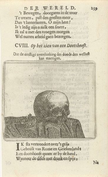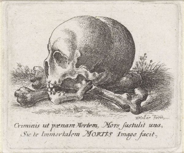 Curator: At first glance, it has the chilling effect of the black plague memorials, that same memento mori aesthetic that urges one to remember the transient nature of existence. Editor: That’s definitely the mood. Looking at Johann Sadeler I's "Vanitasvoorstelling met een schedel en twee beenderen" – a work from sometime between 1560 and 1620, currently housed at the Rijksmuseum – it's easy to get that impression. But tell me, beyond the gut reaction, what catches your eye, symbolically speaking? Curator: Well, right away the skull speaks of death, the ultimate end. Beneath it, we have crossed bones in an X that reifies a warning—hazard, caution, toxicity, as with its adoption into warning labels in industrial applications, yet within its original art form it is presented with more delicacy than starkness. There are slight differences, such as the plants and hill where the remains reside. The image also presents an inscription that continues these motifs into the work. It feels as if the composition is attempting to warn without creating deep disturbance, though this is a balancing act given the inherent theme of the piece. Editor: The interesting thing for me is the technique: it's an engraving. Consider the labor involved, the precise and repetitive actions required to carve those lines into a plate, wiping the ink, the printing itself, how these prints could circulate. Curator: Indeed, this mode of creating and distributing images amplifies the meaning. As a widely reproducible image, it is a symbol circulated en masse that would carry and preserve cultural beliefs and concerns across communities, a visual artifact of shared psychological experience with life and death. Editor: And that dissemination impacts our reading. Instead of singular veneration like a painting, the materiality of the print makes it more like folk art, almost a repeatable charm to ward off evil and give recognition. There’s something powerful in the potential for an artwork like this to have entered daily life in the 16th and 17th centuries. Curator: It does, doesn’t it? I can appreciate that. All those hands it must have passed through. In the end, though, I think it keeps pointing us back to our own mortality, doesn't it? Editor: Absolutely. Its inherent value, both emotional and literal, lives on.