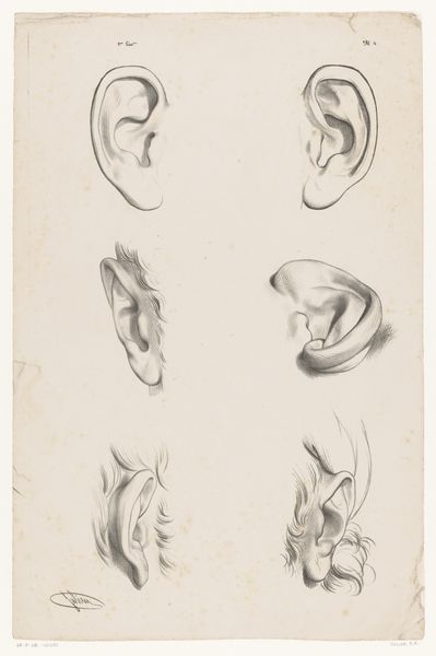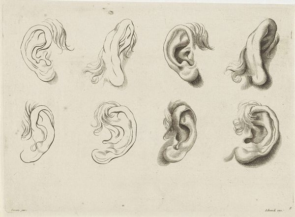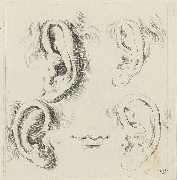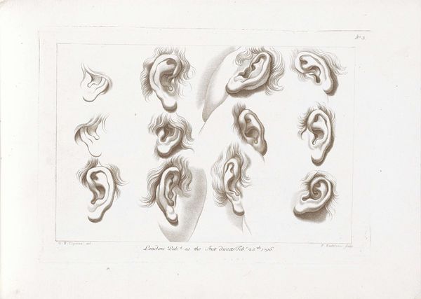 Editor: Right, so, "Twelve Noses and Mouths," possibly from 1796, a pencil drawing by Francesco Bartolozzi. It feels so clinical, almost like a practice sheet, but I'm also strangely drawn to it. All those almost-faces... it’s unsettling. What do you see in this piece? Curator: Unsettling is a good word. It's like stumbling upon someone's discarded dreams. Look closely – notice the nuances in each rendering. The slight upturn of a lip, the way a nose is subtly shaded. It reminds me of those anatomical studies artists would create, dissecting the human form not literally, but artistically. Editor: So it's a study in expression, or rather, the lack thereof? These mouths seem... neutral. Curator: Precisely. But consider the period – Neoclassicism. It's all about order, reason, ideal forms. Maybe Bartolozzi is exploring the building blocks of expression, those tiny details that, when combined, create the full spectrum of human emotion. It also echoes the enlightenment pursuit of objective understanding. I wonder if the very slight differences between each version could represent someone in particular? Editor: Like, trying to distill the essence of portraiture down to its simplest elements? But if it’s objective, why make so many variations? Is he searching for a singular ideal? Curator: Maybe he’s showing us there is no single ideal! Perhaps he understood that even the smallest variance creates something completely new, something undeniably human. It’s like each one whispers secrets from a life never fully lived. Editor: Wow, I never considered it that way! Now they seem less like cold studies and more like… possibilities. Each slightly different set a completely new individual. Curator: Exactly. The absence tells its own story. It challenges us to fill in the blanks, to see beyond the fragment and imagine the whole.