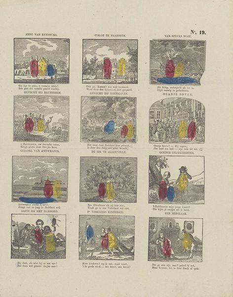 Editor: This is "Alfabet," a mixed-media print from somewhere between 1827 and 1894, currently held at the Rijksmuseum. It reminds me of a page from a children’s book, maybe for teaching the alphabet, with these little scenes illustrating each letter. What do you see in this piece? Curator: What strikes me is the way this ostensibly innocent children's alphabet actually encodes so much about social roles and expectations of the time. Consider the figures: predominantly girls and women. They're shown engaging in domestic activities or playing demurely. Boys, like "Jacob," are shown being active, jumping rope, a common childhood activity, but is the girl also jumping? The women are planting or looking in the mirror. What are these activities really teaching children? Editor: That’s a really interesting point! I hadn’t considered that these seemingly simple illustrations are reinforcing gendered stereotypes. So the activities selected for each letter aren’t arbitrary? Curator: Exactly. It prompts us to consider what these curated depictions communicate to young, impressionable minds. And how did class structure play into these images? The alphabet print may serve to indoctrinate young learners into these structures from an early age. Whose stories are left out, do you think? Editor: It makes you wonder about the stories *not* being told, like working-class children. Or children of color, as racial inequality was a reality in the Netherlands at this time. Curator: Precisely. Examining art through this lens opens up vital conversations about power, representation, and the subtle ways ideology is transmitted. These alphabet primers aren't just educational tools; they're cultural artifacts, revealing what society valued and what it sought to perpetuate. Do you agree that understanding these biases are useful when creating art today? Editor: I absolutely do. I'll never look at an alphabet book the same way again! I'm left thinking about what implicit social messaging our media delivers today.