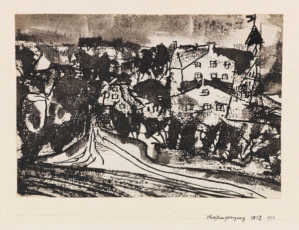 Curator: This intriguing print, by Sir Eduardo Paolozzi, appears to date from 1993. Editor: It's intensely active, almost chaotic. The stark black and white emphasizes the dynamic movement, a real sense of propulsion. Curator: Paolozzi's composition presents a scene rife with conflict, possibly inspired by historical engravings. See the way the architectural elements frame the struggling figures. Editor: The contrast creates a distinct visual hierarchy. The background structures serve as a stage for the foreground action. What’s the narrative context? Curator: Without a title, the specific event remains obscure, but we can infer it may be connected with the history of conflict and urban spaces. Paolozzi often explored such themes. Editor: The density of the composition is almost overwhelming, and yet, the eye is drawn to the forms rising above the crowd. A unique and powerful image.