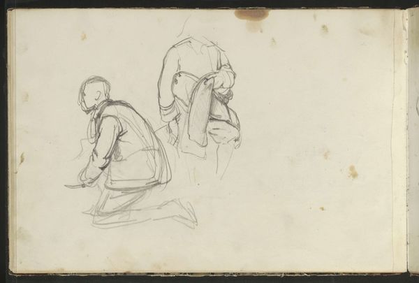 Curator: Here we have John Varley’s "Studies of a Boy, a Man, a Woman, and a Man Sweeping, Slight." It's a delicate pencil sketch. Editor: It feels like a fleeting moment, a quick grasp at the essence of these figures. I am drawn to the negative space and its quietness. Curator: Note how Varley captures form with minimal lines, achieving balance through the distribution of figures across the small support. Editor: It's almost like a visual haiku, capturing a sense of everyday life with such economy. There is something timeless about these archetypes, wouldn't you agree? Curator: Indeed. The composition emphasizes the underlying structure, a dance of line and form. Editor: It makes you wonder about the stories behind those faces, even with just a few lines suggesting their lives. Curator: A fascinating glimpse into Varley's process, and, perhaps, our own perceptions.
