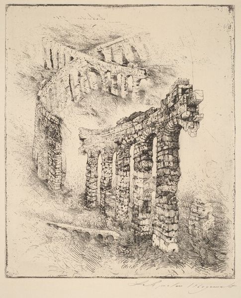 Curator: This is Roger Fry’s lithograph, "Rock-cut Church, Saint Emilion," currently held in the Tate Collections. Editor: It’s remarkably stark, isn't it? The composition directs your gaze through a series of arches, each receding further into shadow. Curator: Fry was deeply engaged with Post-Impressionism. His formal explorations here emphasize the monumental architecture, distilling the church to its essential, structural elements. This imagery was especially poignant amidst the rising tide of secularism. Editor: Absolutely, and his deliberate use of light and shadow heightens the sense of depth and the weight of the stone. The texture feels almost palpable. Curator: Fry, beyond his artistry, greatly impacted how the British public viewed modern art. He challenged academic conventions through institutions like the Bloomsbury Group. Editor: A powerful convergence of form and context, revealing Fry’s deep commitment to both artistic innovation and societal change.