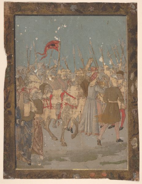 Curator: Here we have "Stations of the Cross No. 8: "Jesus Speaks to the Women of Jerusalem," a watercolor drawing created around 1936 by Geoffrey Holt. It's quite striking, wouldn’t you agree? Editor: Yes, immediately, I'm struck by the...the almost unsettling quality. It's naive, almost childlike, but imbued with such suffering. The pallid washes enhance that mood, don't you think? Curator: Precisely. The stark application of watercolor is pivotal. The composition relies heavily on the figures, their arrangement directing our eye. The forward lean of Christ under the cross is repeated throughout, unifying the image around his central suffering. Editor: He looks utterly spent, the faces are fascinating though - that combination of disdain and...pity? It's there in their eyes. And is that supposed to be halos behind some of the figures to the right, what a curious device! It feels so human, somehow, despite the halos and the obvious religiosity of the subject matter. I suppose the raw simplicity of the rendering does that. Curator: Indeed. Notice the tension created by the orthogonals of the cross in contrast with the somewhat chaotic arrangement of the figures. Holt masterfully guides our gaze with these conflicting compositional tools. Editor: The drawing style almost feels like a medieval woodcut, very folksy with those flattened perspective and simple color choices. I imagine it makes the whole story more accessible. Was Holt aiming for this? It's as though the work transcends its formal religious origins and reaches something quite primal. Curator: I find myself agreeing. Holt's intention is not fully articulated, and to definitively read it would, in effect, close its meaning, wouldn't you say? But the evidence within the painting supports multiple readings that extend into ideas about suffering and compassion and the relationship of these things with a broader audience. Editor: Yes! That slightly jarring execution really does keep you with the image and lets it resonate within oneself rather than as something detached. I walked in thinking that something this clearly and determinedly narrative might seem illustrative, and perhaps distant to me - but quite the opposite happened. Thank you! Curator: It seems, through an analysis of its artistic components, Holt's piece achieves a poignant depiction accessible and meaningful.