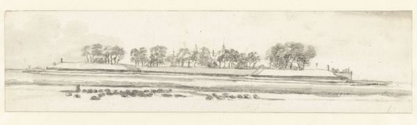Editor: Here we have “Gezicht op Culemborg, 1672” created around 1900-1903 by the Moreau brothers, rendered in pencil and charcoal. The landscape gives off a serene and quiet vibe, despite its almost panoramic scale. What stands out to you most about this drawing? Curator: I'm drawn to how this piece speaks to the historical amnesia that often accompanies the construction of national identity. Here, we have an image titled after a tumultuous year in Dutch history—1672, the “Disaster Year”—yet rendered centuries later, seemingly devoid of conflict. How does the Moreau brothers’ choice to depict Culemborg in this manner, absent of explicit markers of hardship, influence our understanding of Dutch resilience? Editor: That’s interesting, I hadn’t considered that! So the tranquil setting might actually be in conversation with the social memory of a very turbulent time? Curator: Precisely! It invites us to consider how landscapes can function as sites of both remembrance and forgetting. What narrative are the Moreau brothers crafting by deliberately omitting any overt reference to the historical context suggested by the title? Is it an attempt to sanitize the past? To offer a vision of enduring stability in the face of adversity? What does this conscious "overlooking" signify? Editor: Perhaps the focus on the enduring cityscape highlights a sense of continuity and strength amidst past turmoil? Almost as if saying "we were here then, we are here now?" Curator: Yes, and I wonder, does focusing on "everyday" scenes like this downplay historical realities for marginalized communities and reinforce dominant narratives? These kinds of idyllic images can exclude alternative interpretations of the landscape and lived experiences that counter official historical narratives. Food for thought! Editor: This has really expanded my view! I’ll definitely look at landscapes with a more critical eye from now on! Curator: Absolutely! Always try and think of art in a context, and what impact it has!
