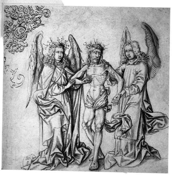 Curator: Here we have "The Annunciation," a tempera painting attributed to Filippo Lippi, created sometime between 1426 and 1469. It depicts a familiar biblical scene, but presented with a fascinating sense of spatial clarity. Editor: Yes, immediately striking is the composition, almost as if staged. There’s a stark division created by that imposing central column; its verticality disrupts what might otherwise be a softer, more yielding portrayal. What's its symbolic function here, I wonder? Curator: Ah, the column! Functionally, it divides the pictorial space and offers architectural rigor. Symbolically, one might see it as the separation between the earthly and the divine realms. Note the distinct settings: Gabriel's chamber has open architecture while Mary's is more domestic. Editor: Good point. Lippi’s precise rendering of light is also arresting. The shadows delineate form with almost sculptural intensity, a quality so evocative of early Renaissance concern with volume and presence. Curator: Indeed. The use of chiaroscuro is masterly, drawing our eyes to key areas: the angel's face, Mary's hands in prayer. Consider the subtle gradations of tone that suggest weight and texture, making these figures powerfully real. Editor: And that careful orchestration also serves the narrative. This isn't just visual display; it's about conveying emotional depth. Mary's posture of humility, for instance, isn't only conventionally pious. I can't help but wonder about how contemporary audiences viewed portrayals of women. Curator: It certainly invites many readings. Lippi seems caught between the decorative patterns reminiscent of earlier painting and this emerging interest in naturalism. Do the angel's wings appear disproportionately large, almost awkward, given the emerging techniques in realism? Editor: Yes, there's a deliberate emphasis. It underscores the celestial nature of the messenger. So, even a formal device serves to enrich narrative understanding, revealing broader societal values. Curator: Exactly. It highlights how technical choices impact our viewing. This artwork invites engagement on both a purely visual and a historically informed level. Editor: It leaves one considering the intersection of artistic technique and the prevailing ideologies shaping perceptions during this period.