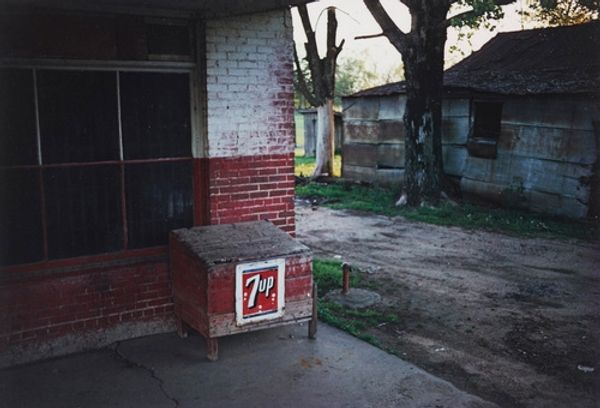This photograph, "Untitled (Car in Parking Lot)" was made by William Eggleston, and it feels like he was just hanging out, waiting for something to happen. Eggleston's colour palette here is all about the gritty, sun-baked reality of the everyday, the unremarkable. Look how the faded browns and greys are punctuated by the rusty red of that pole base. It's like a visual hiccup, a small disruption in the mundane. Speaking of that pole, it's kind of the star of the show, isn't it? The way it anchors the image, the rough texture of the concrete, and the scrappy weeds growing around it. There is no real, clear moment, no dramatic event: rather, Eggleston seems to have just raised his camera and caught whatever was happening in front of him at that time. I'm reminded of other photographers, like Stephen Shore, who also found something compelling in the most ordinary places. It makes you wonder, what else are we missing if we don't slow down and really look?