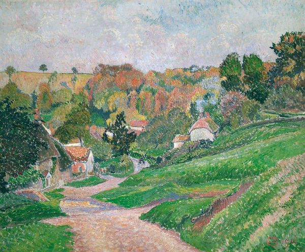 Editor: This is "Mill on the Couleuvre at Pontoise," painted by Paul Cézanne in 1881. Looking at it, I’m really struck by the texture. You can almost feel the thickness of the paint. The scene feels calm and familiar. What captures your attention when you look at this piece? Curator: Ah, Cézanne! This work breathes, doesn't it? I'm always pulled in by how he builds form with color. Notice how he uses different shades of green and brown not just to represent trees and fields, but to construct their very volume. It’s almost architectural. I feel like he's saying that painting isn't just about seeing, it’s about feeling and building the world anew on canvas. Doesn't it make you want to just… smear paint and see what happens? Editor: Definitely. The way he stacks those colors gives a real sense of depth, even though the brushstrokes are so visible. Did he often paint en plein air? Curator: Yes, often. Painting outside, wrestling with the fleeting light, really shaped his approach. He wasn't interested in photographic realism; he wanted to capture something more profound, a kind of underlying structure of nature. It's like he's asking, "What is a tree, really?" and answering with these audacious daubs of paint. Makes you rethink what "real" even means, doesn't it? Editor: It does! I always thought of Impressionism as being all about fleeting impressions, but this feels so much more solid. Curator: Exactly. Cézanne pushes past that fleeting moment, seeking something enduring. That's why they call him a Post-Impressionist! He wanted to dig deeper, build something that would last. So, what began as a calm, familiar scene is now revealed as a profound meditation on perception, structure, and the very act of seeing. What a journey, eh? Editor: Absolutely. I see it in a completely different light now.
