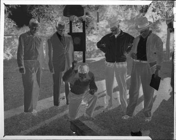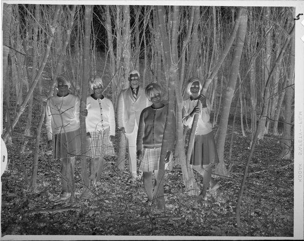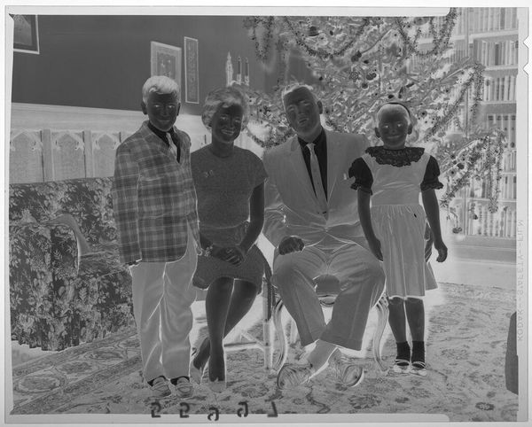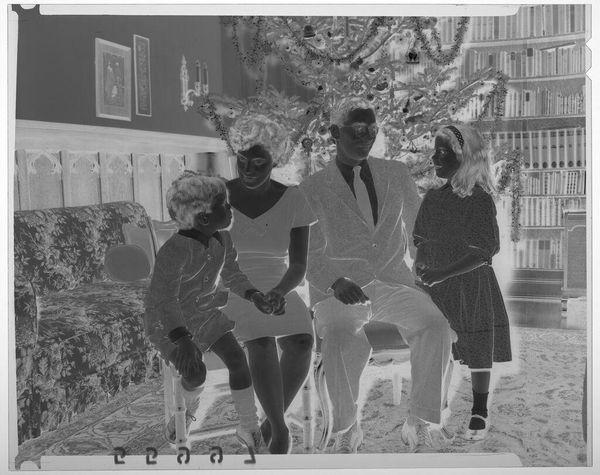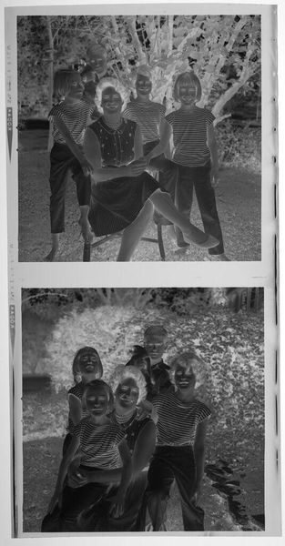 Curator: Here we have an untitled work by Lucian and Mary Brown, a family portrait taken outdoors. The dimensions are approximately 10 by 12 centimeters. Editor: It has a strange, ethereal quality, almost like a dream. The inverted tones give it a haunting, otherworldly feel. Curator: Considering its possible time, could the choice of the family to position themselves on a fence speak to broader themes of societal boundaries and class? The father stands behind, almost supervising. Editor: That fence is interesting. Fences often symbolize boundaries, privacy, or exclusion. But there's also an element of casualness, suggesting a space where public and private realms meet. The dog adds a layer of fidelity and domesticity too. Curator: Placing the family group in the context of domesticity definitely allows us to read more into the family dynamic, the dog is a clear symbol of love and family connection. Editor: The inverted tones give the scene an element of timelessness. I find this portrait more compelling as a meditation on familial bonds. Curator: Agreed, a simple portrait that is more complicated than it initially appears.