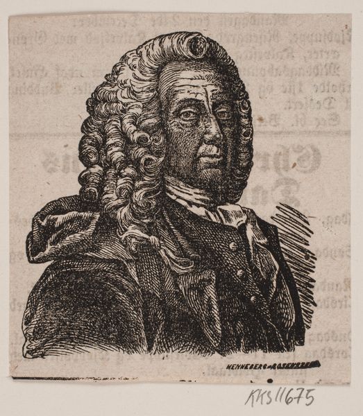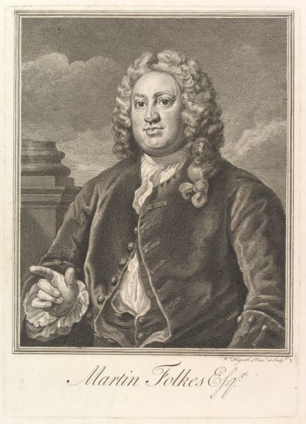 Editor: This is a self-portrait of William Hogarth, from 1785, made using etching and engraving. It is very detailed, particularly the hair and clothing, though it appears aged and faded. It projects a serious yet approachable persona. What aspects of its construction do you find particularly noteworthy? Curator: What strikes me immediately is the intricate interplay of line. Observe how the density and direction of the etched lines modulate to define form and texture. The artist employs cross-hatching in the darker areas to achieve tonal depth and solidity. Editor: I see, the cross-hatching really defines the curves of his coat and hair, contrasting against the smoother areas. Curator: Precisely. Note also the almost sculptural quality achieved through purely linear means. The way light seems to caress the artist's face. Do you find the composition effective in focusing the viewer's attention? Editor: Yes, the face is very luminous compared to the coat. The dark-to-light contrast, paired with the artist’s gaze directed at us, guides our eyes directly there. I am interested in what the different planes mean. Is he attempting to make art criticism part of the piece? Curator: An interesting suggestion. It is also vital to appreciate how an image such as this might have engaged audiences conditioned by diverse contemporary graphic traditions. These forms served various purposes. Looking at these portraits it makes me contemplate our notions of self today. Editor: I see now how analyzing the structural elements can tell us so much about not only the piece but ourselves, even when an artist is in portraiture. Curator: Precisely. Close formal study provides an entry into comprehending art from vastly distinct periods, places, and artists.