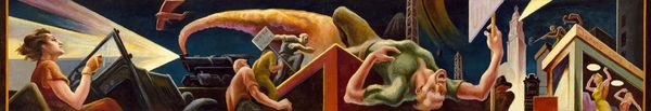 Curator: Here we have Thomas Hart Benton’s 1947 oil painting, "Achelous and Hercules," currently residing at the Smithsonian American Art Museum. Editor: It strikes me as a vibrant but strange tapestry, the muscular figures, the ox, and that curious cornucopia form. What does it all signify? Curator: Well, it draws from classical mythology. This illustrates the story of Hercules wrestling Achelous, a river god who could transform into different forms, represented here most notably as the bull. The fight arose over the hand of the princess Deianira. Editor: Ah, so the bull symbolizes Achelous, a contest of strength and perhaps, dominion over nature itself. The formal rendering is quite compelling, those dynamically contorted figures convey great energy. Curator: Precisely! And notice the cornucopia—horn of plenty, filled with fruits and vegetables, suggesting the prosperity that comes from controlling the land and, in essence, overcoming chaotic forces like Achelous. It represents a deep cultural need for agricultural abundance, echoed through centuries of symbolic imagery. Editor: Indeed, the symbolism is hard to ignore. I appreciate how the artist uses strong, curvilinear forms to suggest muscularity and strain, and how the muted tones offset the bright figures that form the story's climax. The overall impression gives it a mythical gravity. Curator: Consider also the socio-political context. Painted just after World War II, the work may symbolize the struggles of America and its ultimate triumph, mirroring Hercules' victory over unruly, natural forces. There are visual echoes of pastoral life, a potent signifier of a harmonious, post-war order. Editor: Yes, I observe the other elements—farmers toiling, fertile lands—all these contribute to a sense of optimistic renewal and mastery over the land, though I still find its somewhat restless, crammed composition distracting. It’s a dense arrangement of shapes! Curator: And there lies a strength in Benton's narrative—how he merges personal and collective symbolic interpretation into a sweeping picture, resonating long after the war ended. Editor: An impressive marriage of form and symbol, truly. It certainly rewards extended reflection.