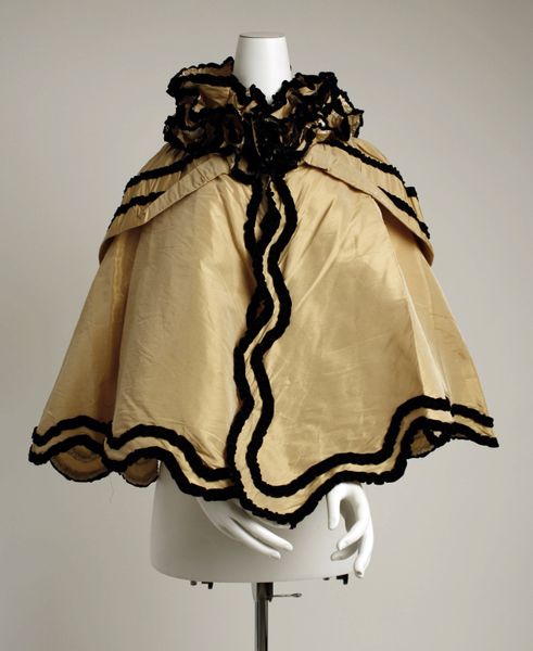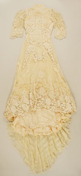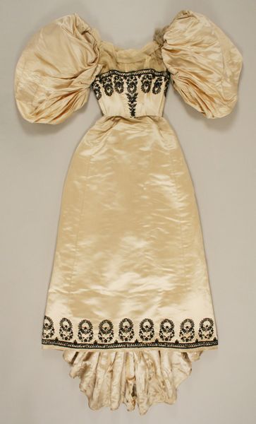 Editor: This "Ball Gown," dating from 1882 to 1892, by the House of Worth, uses textile to achieve this elaborate shape and intricate decoration. It almost feels like a sculptural object, more than just a dress. What's most interesting about this piece to you? Curator: It's crucial to consider the material and the labor involved in producing such a gown. Think about the silk – where did it come from? Who spun it, dyed it? The embellishments too, each ribbon, each stitch. These weren't simply aesthetic choices; they represent a vast network of production and consumption. Editor: So, beyond its beauty, it reflects an entire industry? Curator: Exactly! And we must remember that Worth was catering to an elite clientele. This gown embodies the opulence of the Gilded Age, a period of intense economic inequality. The materials signify status, wealth, and power, showcasing how clothing functioned within a rigid social hierarchy. Editor: So it’s less about the individual designer and more about the system? Curator: It's both. Worth's genius was in understanding and catering to the desires of his wealthy patrons. However, his success was also built on the backs of countless workers, often exploited, who produced the materials and constructed these elaborate garments. Editor: That reframes how I see it. Now I see labor embedded within the fabric itself. Curator: Precisely. Examining the materials and the means of production opens up a conversation about labor, class, and consumption that goes far beyond the surface aesthetic of the gown. It gives us a tangible connection to the economic realities of the time. Editor: That’s given me a whole new appreciation, seeing it not just as a beautiful object but as a historical artifact. Thank you.