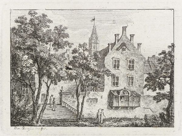 Curator: Here we have "De havezathe Vechterweerd bij Zwolle in 1729" a drawing created with ink by Aert Schouman, finalized in 1749. Editor: There’s something so gentle about it. The limited tonal range creates a calming, almost ethereal atmosphere. The composition directs your eye through the estate methodically, yet…without strict rigor. Curator: The composition establishes a clear hierarchy. The gate with its detailed carvings dominates the immediate foreground, drawing us towards the primary structure of the Vechterweerd estate behind it. Note Schouman’s attention to proportion. Editor: I'm struck by how Schouman infuses symbols of Dutch affluence into a seemingly simple genre scene. Notice the carefully positioned figures and even the family dog. What story are they meant to communicate, I wonder? Curator: Precisely! The artist emphasizes line and form, notice how the rooftops are handled; that creates an intricate network of lines, a key Baroque convention. The texture achieved is striking, given the medium. Editor: The gateway certainly acts as a liminal space, both inviting entry and subtly suggesting exclusion. Perhaps it's emblematic of the Dutch Golden Age: displaying prosperity but guarding it carefully? Curator: The architectural details communicate not just wealth but civic order. This echoes core Enlightenment principles. Notice how each component, down to the ornamental spheres atop the gateposts, contributes to the whole’s visual and philosophical impact. Editor: Considering the socio-cultural backdrop, doesn't it prompt consideration of those beyond the estate walls? Curator: Good point. While Schouman's artwork meticulously renders affluence, it’s true he remains primarily preoccupied with formal presentation. Editor: In the end, it remains an idyllic scene, masterfully composed, even if it's laced with undertones. Curator: Indeed, a fascinating convergence of meticulous technique and symbolic undercurrents!
