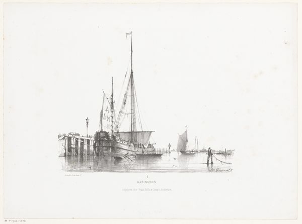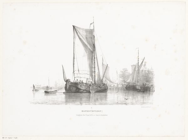 Editor: Here we have "Turfschip," a pencil and print artwork by Johan Conrad Greive, dating back to around 1860. Looking at it, I’m struck by the tranquility – almost a hazy stillness hangs over the water. What do you see in this piece? Curator: It's interesting you pick up on that stillness. To me, it speaks volumes about 19th-century Romanticism’s fascination with nature's quiet power, right? Greive's technique here – that delicate pencil work and shading - adds to that sense of dreamy reflection, doesn't it? Imagine him there, capturing not just the scene, but the very feeling of the water, the light on the old boats. It is almost nostalgic. What is a boat if not nostalgia on water, an urge for things past. Editor: Nostalgia, that's it! It's like he's romanticizing this working boat, these ordinary people. Do you think that’s accurate? Curator: Absolutely! Remember, this was a time of massive industrial change. The Turfschip, a boat used for transporting peat, probably evoked simpler times, times past. Think of it this way: is he just drawing a boat, or is he drawing a memory? And for whom? Himself, perhaps, or for a city racing toward progress? And have a look at that sky! So much space left deliberately blank. Is it sky? Is it mist? A space for the soul to float up and away? Editor: It does invite the viewer to imagine, doesn’t it? It makes you consider life then, and how it’s perceived now, centuries later. It is definitely not just a boat. Curator: Not just a boat at all. Sometimes the simplest images hold the biggest stories, I suppose.