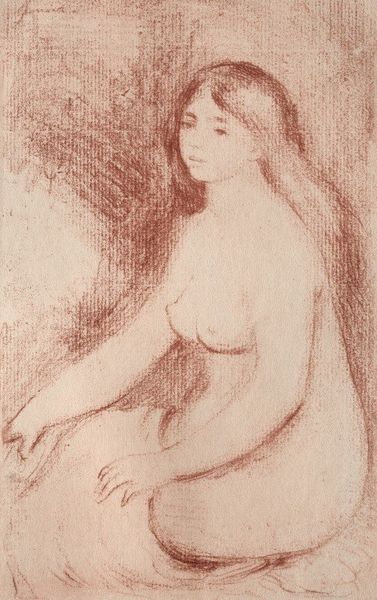 Curator: Oh, this drawing makes me think of rainy afternoons and secret whispers. The way the colours melt together – a warm embrace captured on paper. Editor: Yes, Helleu’s "Nu Féminin à la Longue Chevelure"—a drawing rendered in pencil and charcoal—conjures a very specific mood. It reflects the aesthetic interests of its time, especially regarding the representation of female bodies within intimate settings. Curator: It's quite the opposite of grandiose, wouldn’t you agree? More of a shy, intimate kind of beauty. Like seeing someone lost in their own daydream. Editor: Exactly. The woman's gaze is averted, her body turned inward, creating a sense of privacy but, of course, always from a male gaze. The question becomes: what does this level of observation reveal about societal attitudes concerning visibility and vulnerability? Curator: I see what you mean. The lines, though, feel so effortless! Like a quick sketch, but loaded with unspoken emotion. Do you get that feeling, too? The emotional residue of observation? Editor: Helleu’s use of line is striking. It invites conversation, definitely, and forces us to confront issues surrounding both voyeurism and objectification within artistic practices – in how beauty is perceived and, inevitably, commodified through representation. Curator: Perhaps that is it... there is both elegance and a tinge of discomfort present in this drawing. It's an interesting emotional collision that stays with you after the initial, easy attraction of line and beauty. Editor: It highlights the tension between personal expression and established cultural norms—we need to question this artistic gaze to critically analyse art history and to open possibilities for decolonisation of representation. Thank you for offering this opportunity for questioning. Curator: Yes, questioning the beauty! Ultimately, that’s why art pulls us back in to discover a little something more about who we were and where we might go next, both in art and in thought.