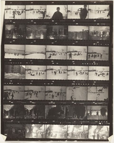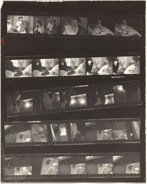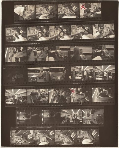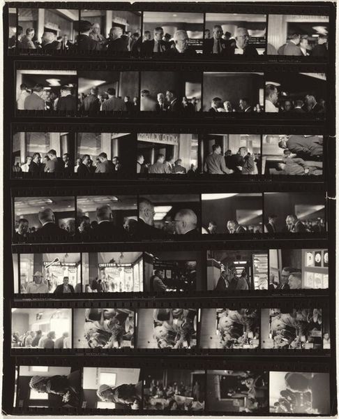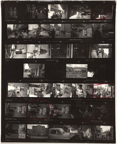 Editor: So, here we have Robert Frank's "Early New York City 6" from 1954, a gelatin silver print. It's... well, it looks like a film strip, contact sheet. I’m struck by how raw and immediate it feels. All these glimpses into a past New York City. What do you see when you look at this? Curator: Raw and immediate is spot on. It's almost voyeuristic, isn't it? A collection of captured moments, strung together like a memory. But what kind of memory? For me, this sheet breathes a narrative. Each frame isn't just a standalone image. They resonate against one another. Take the repetition of figures walking left to right across the frames; What's their story? Editor: That’s true, seeing them together like this builds something… Like the image of the faces on a corner contrasting with one lone man. There's a conversation there, a story being hinted at. Curator: Exactly! And that's the beauty of Frank’s work. He presents the poetry in the everyday. This isn’t just a document; it's a feeling, an impression. There is the urban landscape, of course, the buildings, and advertisements. Do they create rhythm for your eyes? Editor: The signs are great – this photo definitely communicates an era to the viewer. Curator: Indeed, these kinds of elements – both the physical ones and more ambiguous gestures, or fleeting glances – are like lyrical pauses in a city’s relentless rhythm. It almost reminds you to reflect on what’s usually blurred. Editor: Looking at the collection of photographs laid out like this changes the way I thought of street photography. Thank you. Curator: My pleasure! It’s photographs like these that reminds me why I love finding hidden treasures.