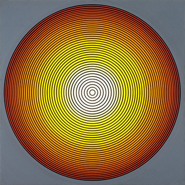 Tadasky made ‘C 200’ using flat planes of colour in concentric circles. The colours are really upbeat, almost pop-art, and laid down with precision, which is interesting because when I paint circles they tend to wobble all over the place. I like the way the lines of colour are softened by a kind of halo effect, like an aura. It's almost as if the colours are buzzing on the canvas. The surface looks really smooth, which makes me think about control, and the way hard edge painting can almost become an illusion. How much the artist is present, and how much they are trying to disappear. The central point seems off, like a slight disruption. Perhaps that’s just my eye, or maybe it’s a tiny hint of something off-kilter in an otherwise controlled process. There's something here that relates to the work of Bridget Riley. Both artists really make you think about the act of perception.