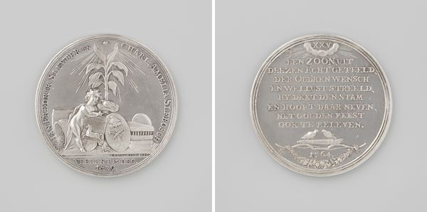Curator: Here we have a metal relief from 1839 by David van der Kellen, currently housed at the Rijksmuseum, commemorating the wedding of Willem Alexander and Sophia Frederika Mathilda. It's quite lovely. Editor: Yes, it has a rather severe neoclassical style—the monochrome rendering emphasizes form above all else. The figure on the one side is so small, it makes the text overwhelming! Curator: I think the decision to work in metal reflects the social function of this piece. It's meant to memorialize a historical event. By choosing metal, van der Kellen elevates what could be dismissed as mere craft. It's more durable than paper. Editor: Yes, the permanence and cool, hard texture speak to an objective truth, an unchanging fact that’s recorded. It's interesting how the medium informs the message and reception. The use of negative space too frames both figures, drawing focus. Curator: This object becomes symbolic capital, cementing the legitimacy of this union between the Dutch and Württemberg families. We have on one side, an allegorical figure accompanied by coats of arms; on the reverse we can see an inscription naming the celebrated couple enclosed in a decorative wreath of leaves and ribbon. Editor: Right. And the inscription becomes integral to the composition—balancing the figural elements. Both sides display similar amounts of raised work within their compositions—an interplay of symbolism and textual framing devices Curator: Consider the role of craftsmanship in such an object! Each line of text, each detail in the coat of arms, would be worked painstakingly by hand to give material expression to sovereign power and history. What looks static had intensive labor involved. Editor: Well said! And thinking about the choice of material itself allows a richer understanding beyond what the images alone tell. We find elegance born from calculated choices around production value, symbolism, and historical context. Curator: I've learned that by focusing on the details and considering materials and modes of creation, this seemingly distant work of art suddenly becomes rather vibrant. Editor: Indeed. A close analysis reveals that a wealth of choices underpin the simple declarative style in view.